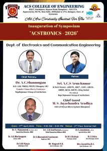 The Department of Electronics & Communication Engineering at ACS College of Engineering proudly presents ACS Tronics – Symposium 2026. This technical symposium aims to bring together innovation, creativity, and engineering excellence. The event will provide a platform for students to showcase their talents through various technical events, competitions, and knowledge-sharing sessions.