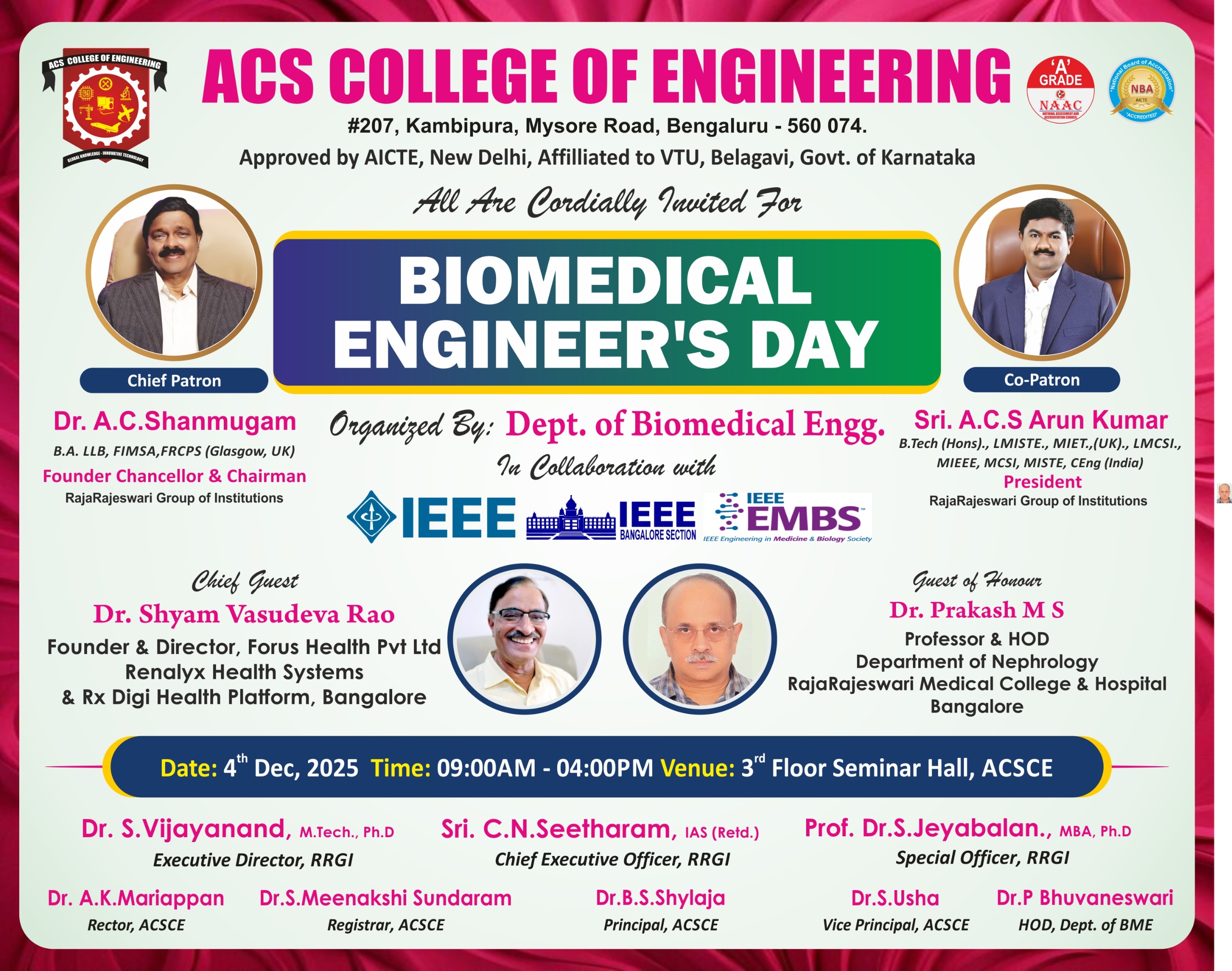 The Department of Biomedical Engineering is organizing Biomedical Engineers Day – Project Expo & BME Health Check-up on 4th December 2025. This event aims to celebrate innovation in biomedical technology while promoting health awareness among students and faculty.