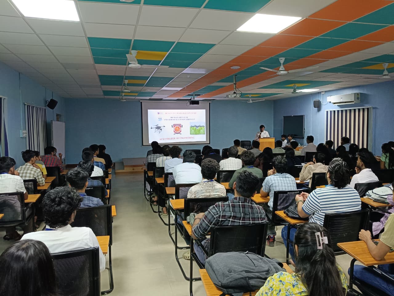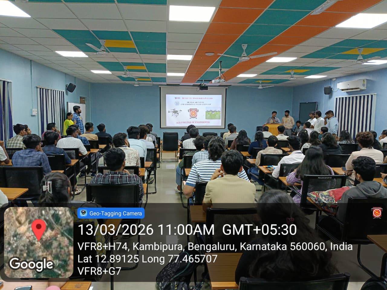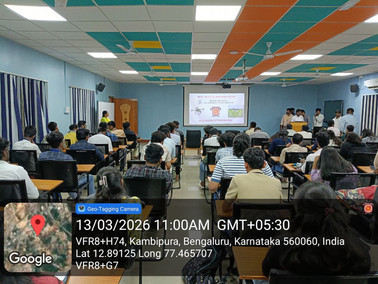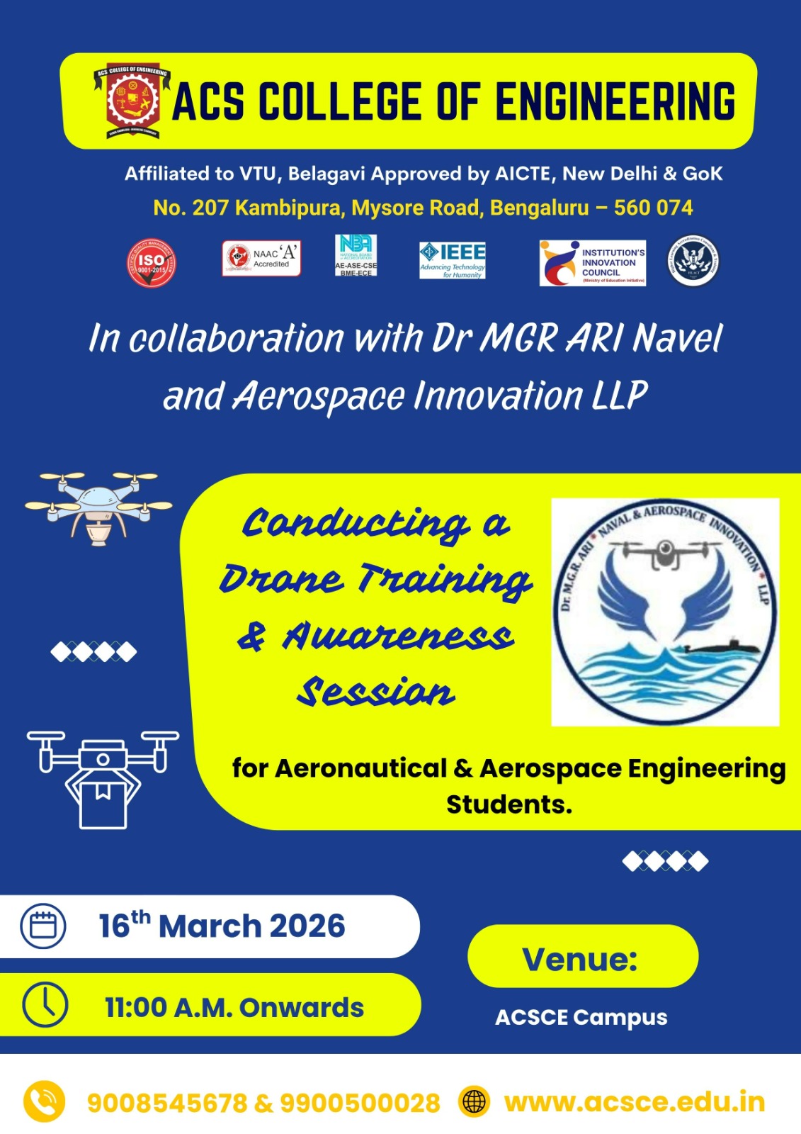 The Department of Aeronautical Engineering at ACS College of Engineering successfully organized a Drone Training and Awareness Session on 13th March 2026 in collaboration with Dr MGR ARI Naval & Aerospace Innovation LLP. The session aimed to provide students with practical exposure and theoretical understanding of drone technology, which is rapidly transforming sectors such as defense, surveillance, agriculture, logistics, and aerial mapping. With the growing importance of Unmanned Aerial Vehicles (UAVs) in modern engineering applications, this program was designed to bridge the gap between academic learning and industry requirements.
