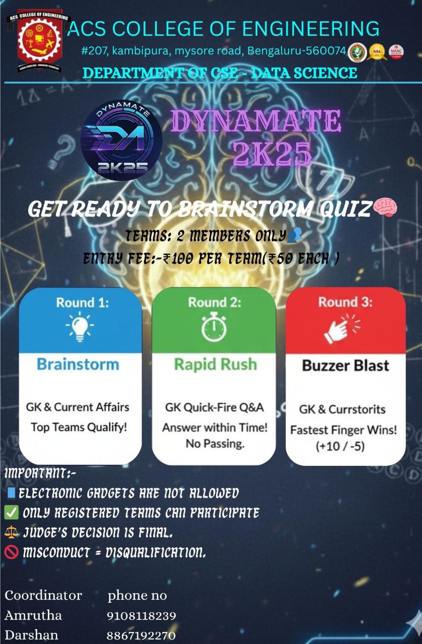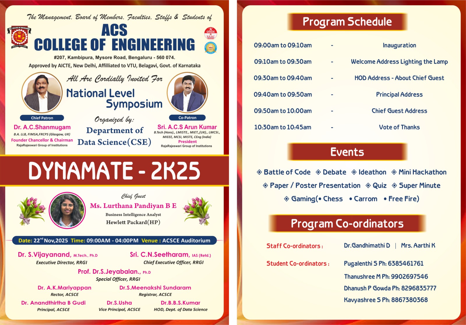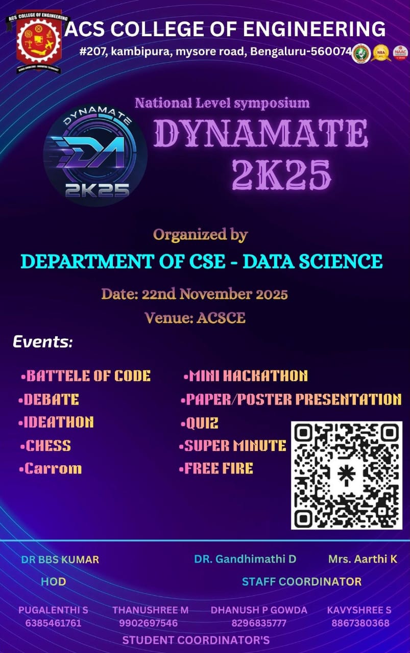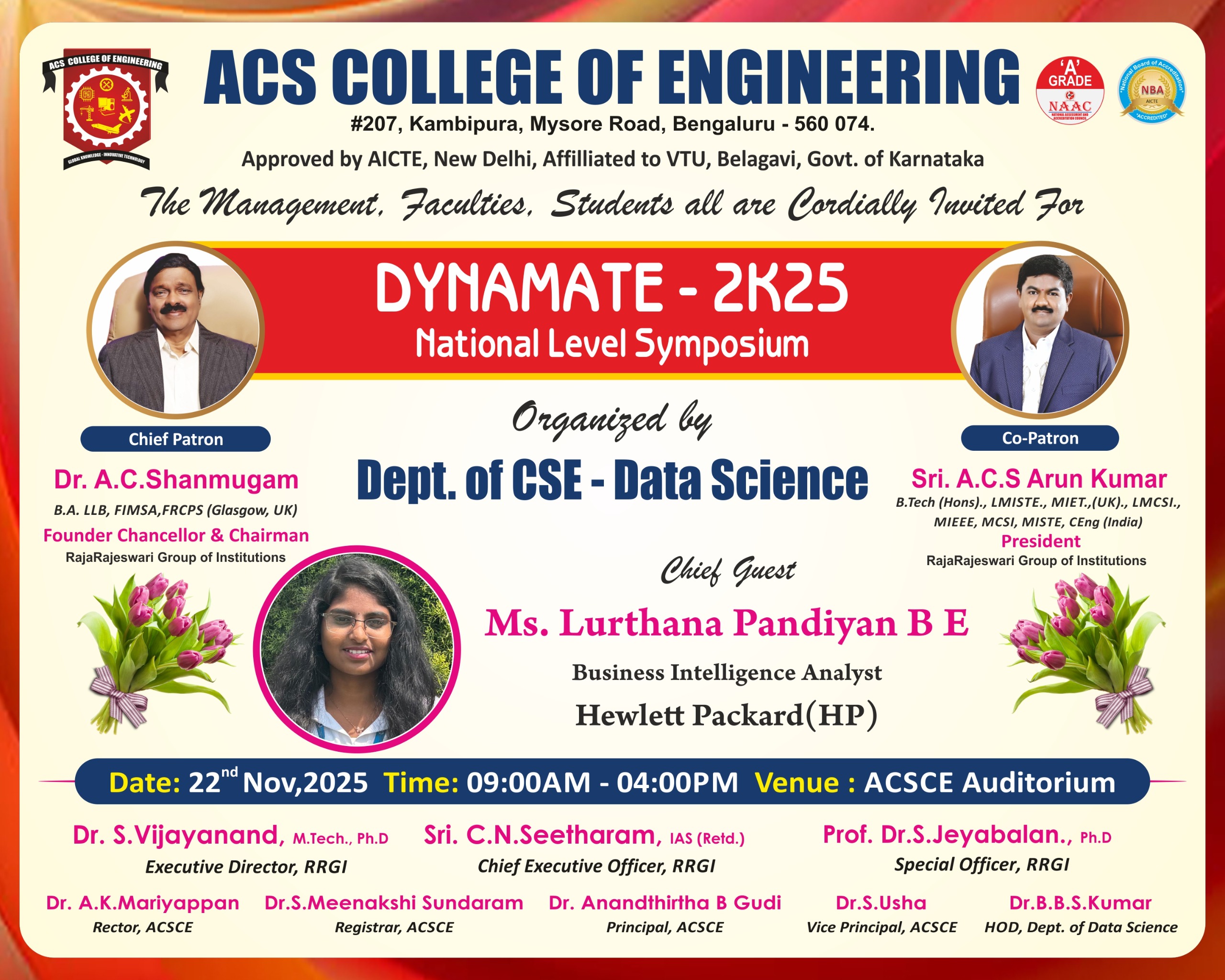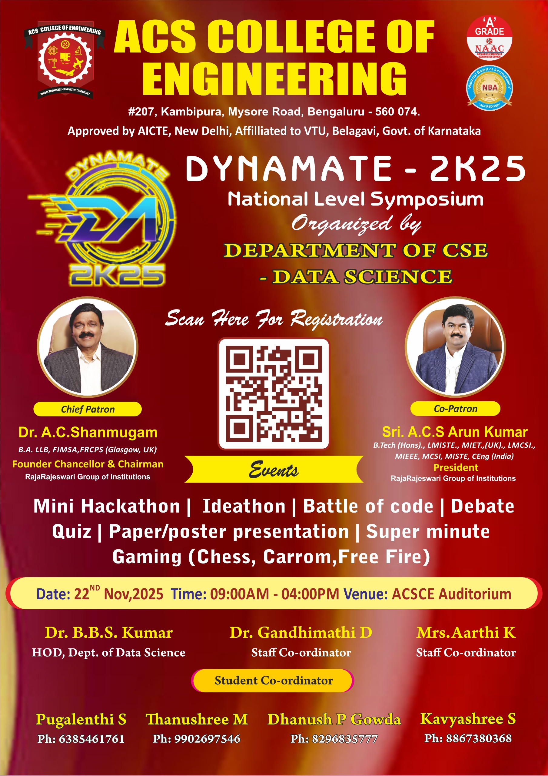 The Department of CSE – Data Science at ACS College of Engineering proudly hosted DYNAMATE 2K25, a National Level Technical Symposium, on 22nd November 2025 at the ACSCE Auditorium.