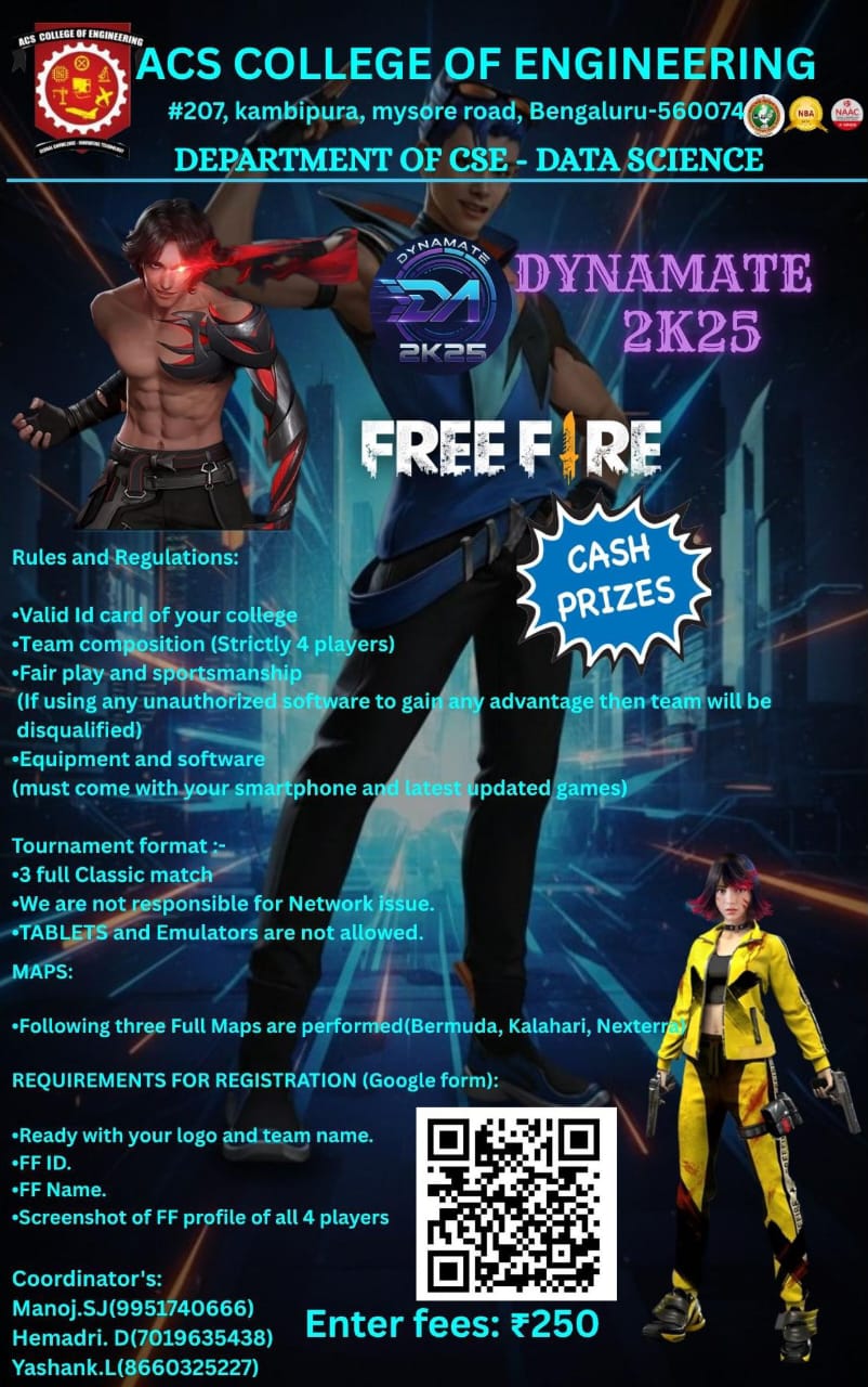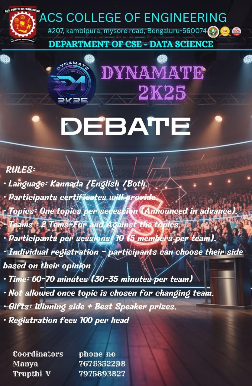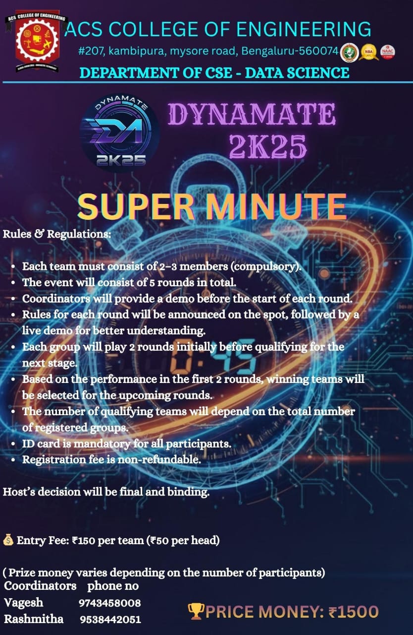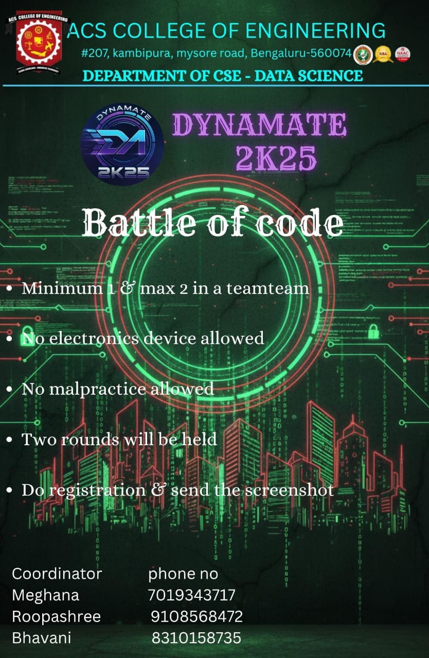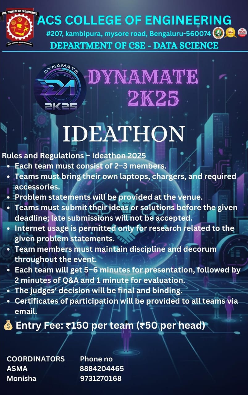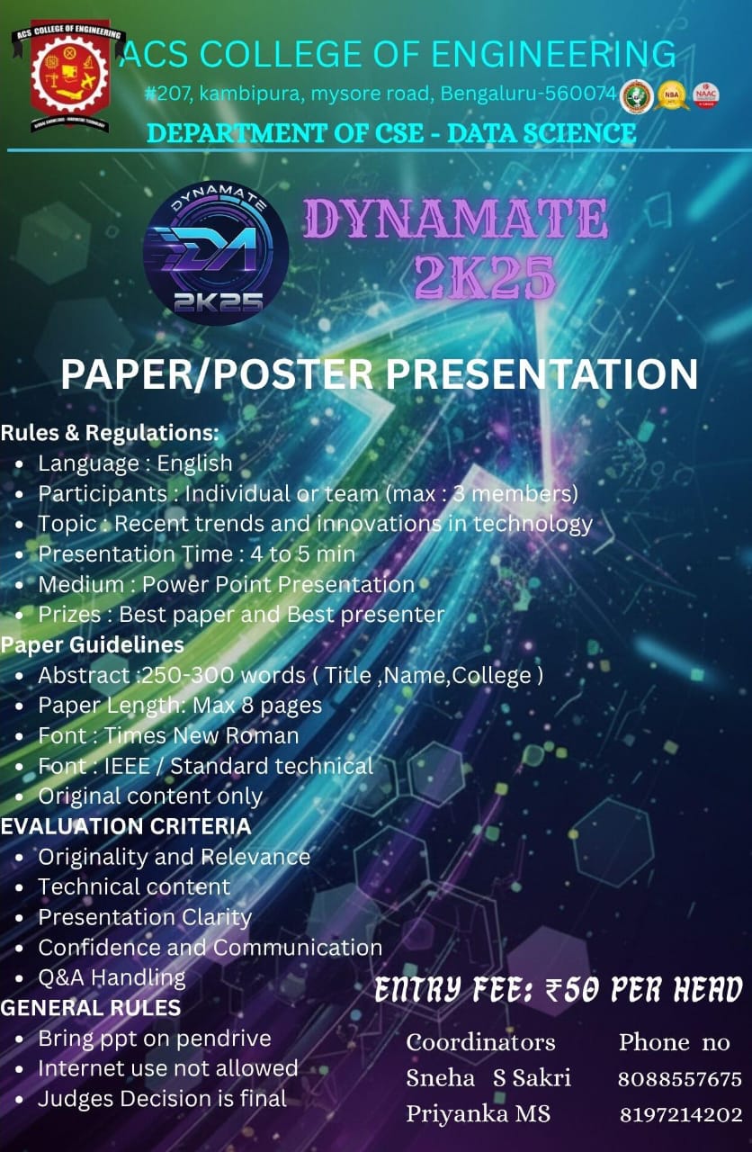 The Department of CSE – Data Science at ACS College of Engineering proudly hosted DYNAMATE 2K25, a National Level Technical Symposium, on 22nd November 2025 at the ACSCE Auditorium.