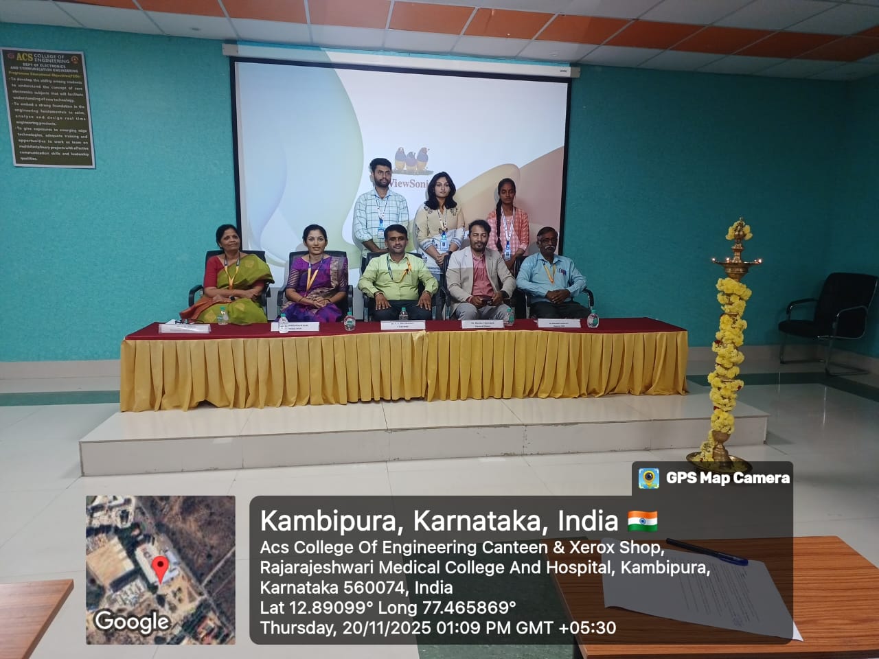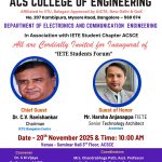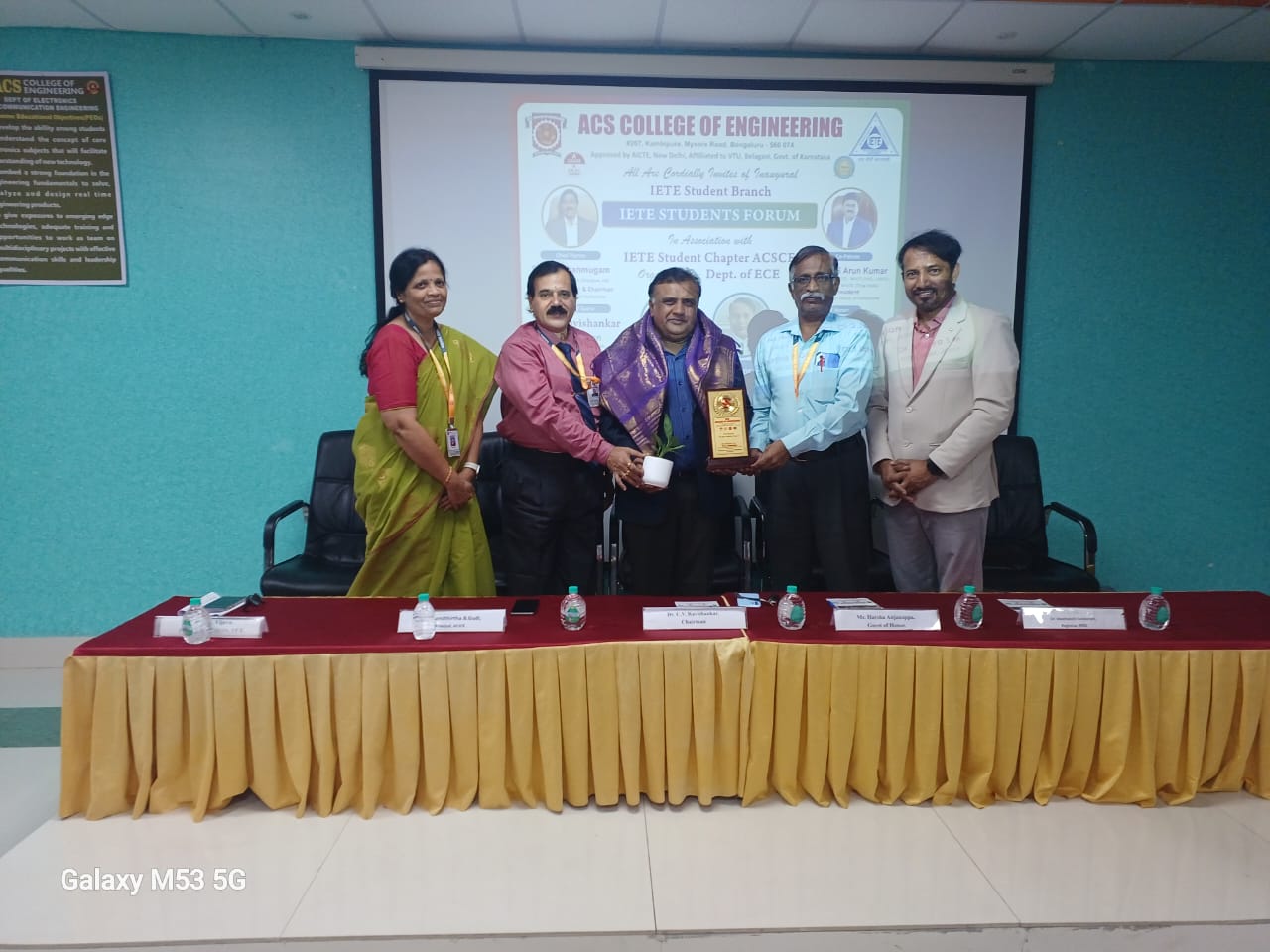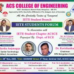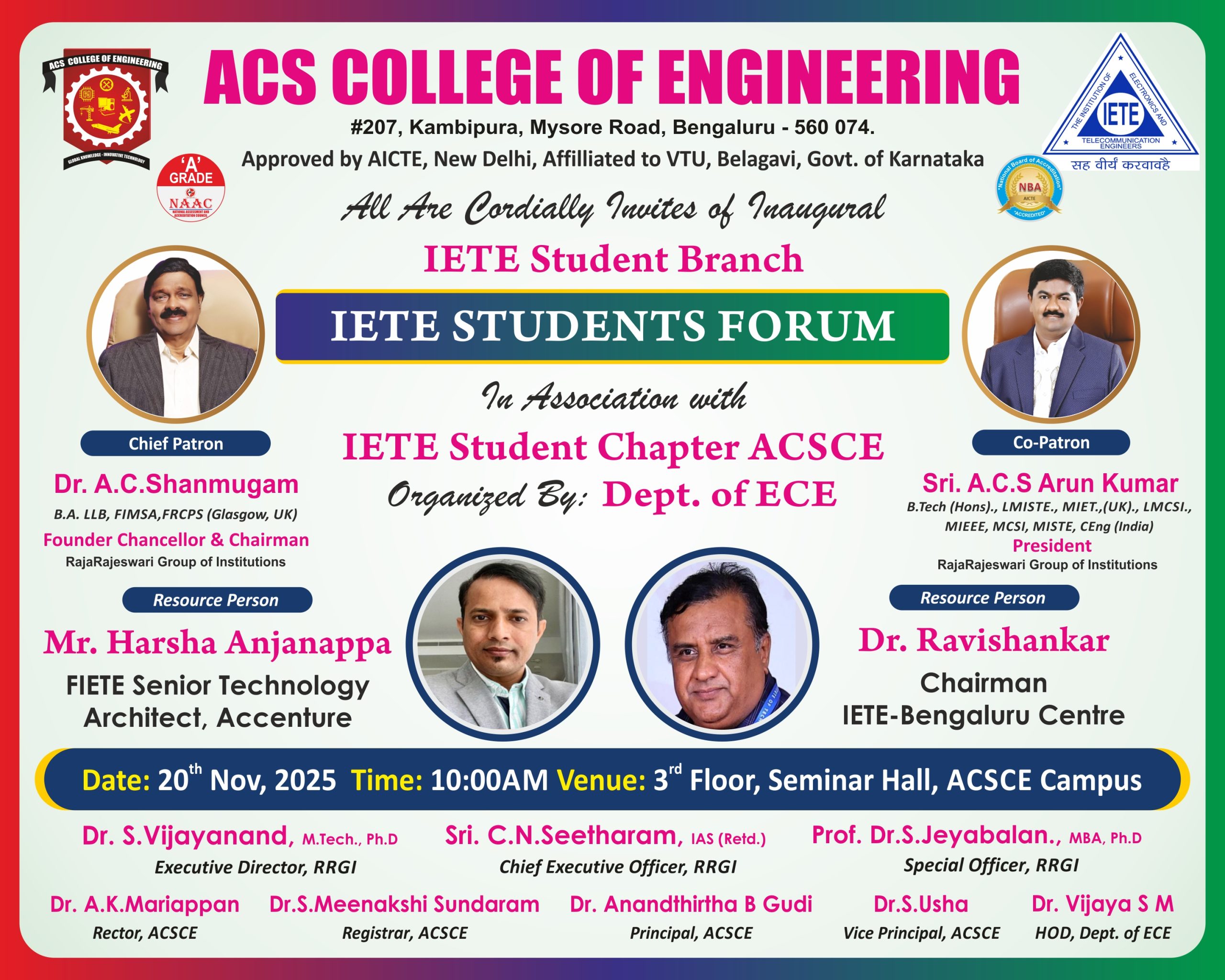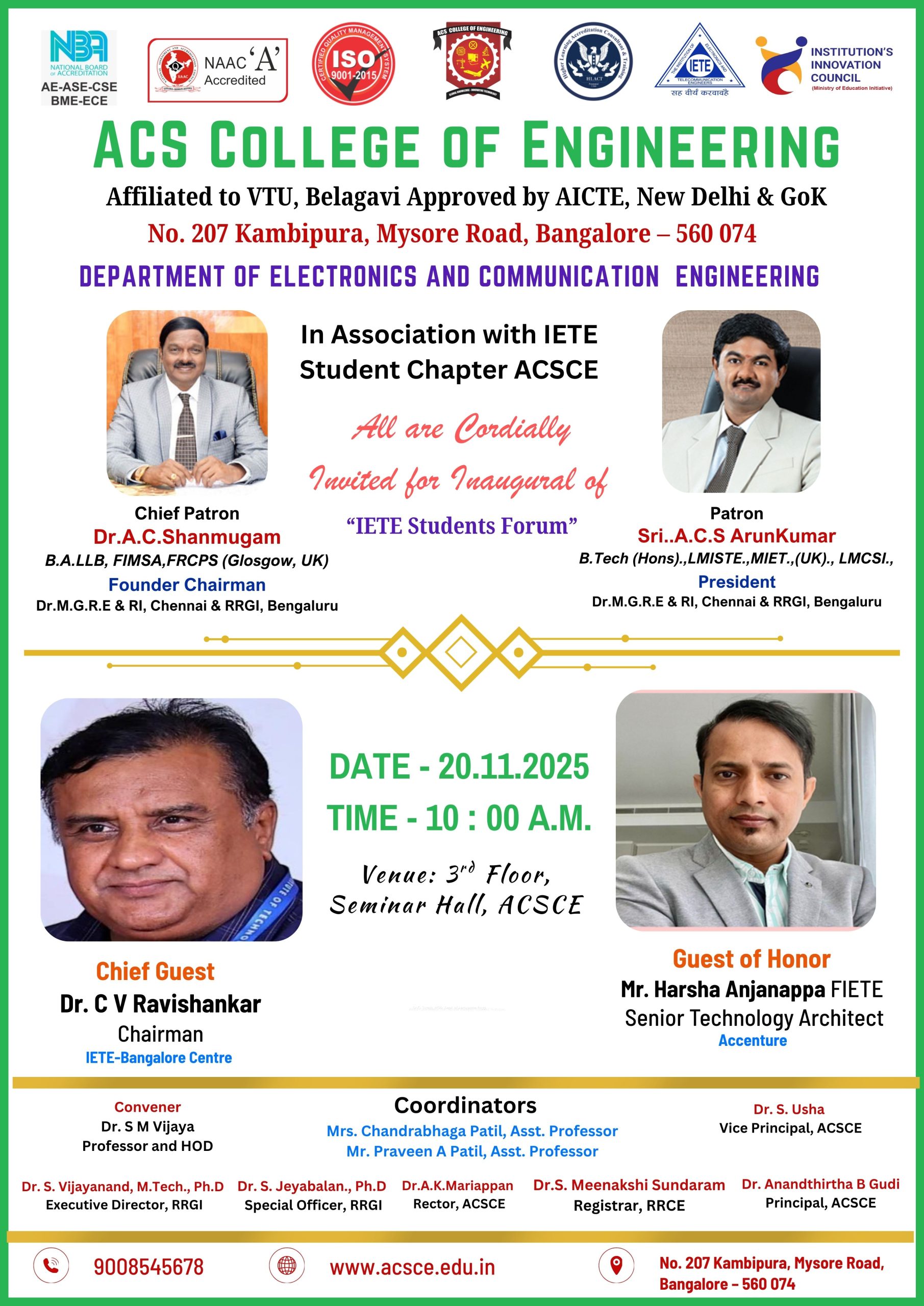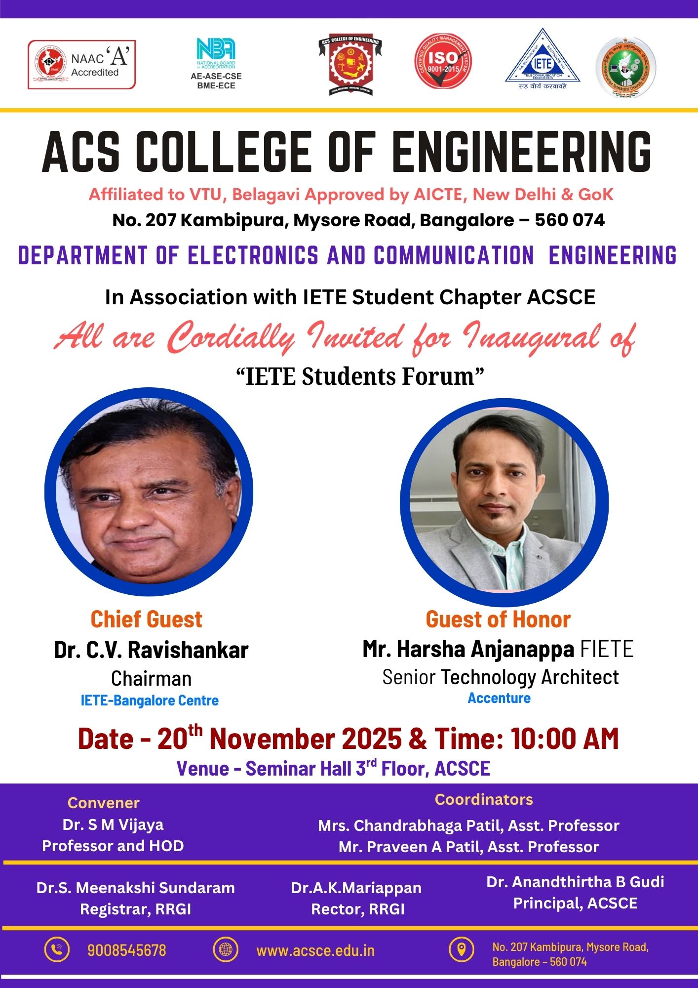 The Department of Electronics and Communication Engineering, in association with the IETE Student Chapter – ACSCE, successfully inaugurated the IETE Students Forum on 20th November 2025 at ACS College of Engineering. The ceremony commenced with a welcome address followed by the lighting of the lamp, symbolizing the beginning of new opportunities for innovation and learning in the field of electronics and telecommunications. The Chief Guest, Dr. C. V. Ravishankar, emphasized the significance of professional forums like IETE in bridging academic learning with industry standards. The Guest of Honor, Mr. Harsha Anjanappa, inspired the students by sharing insights into emerging technologies and career prospects. This initiative aims to empower students with technical exposure, hands-on workshops, expert talks, and participation in national-level competitions, fostering a culture of creativity and engineering excellence. The event concluded with a vote of thanks, expressing gratitude to the dignitaries, faculty, and enthusiastic student members who made the inauguration memorable and impactful.