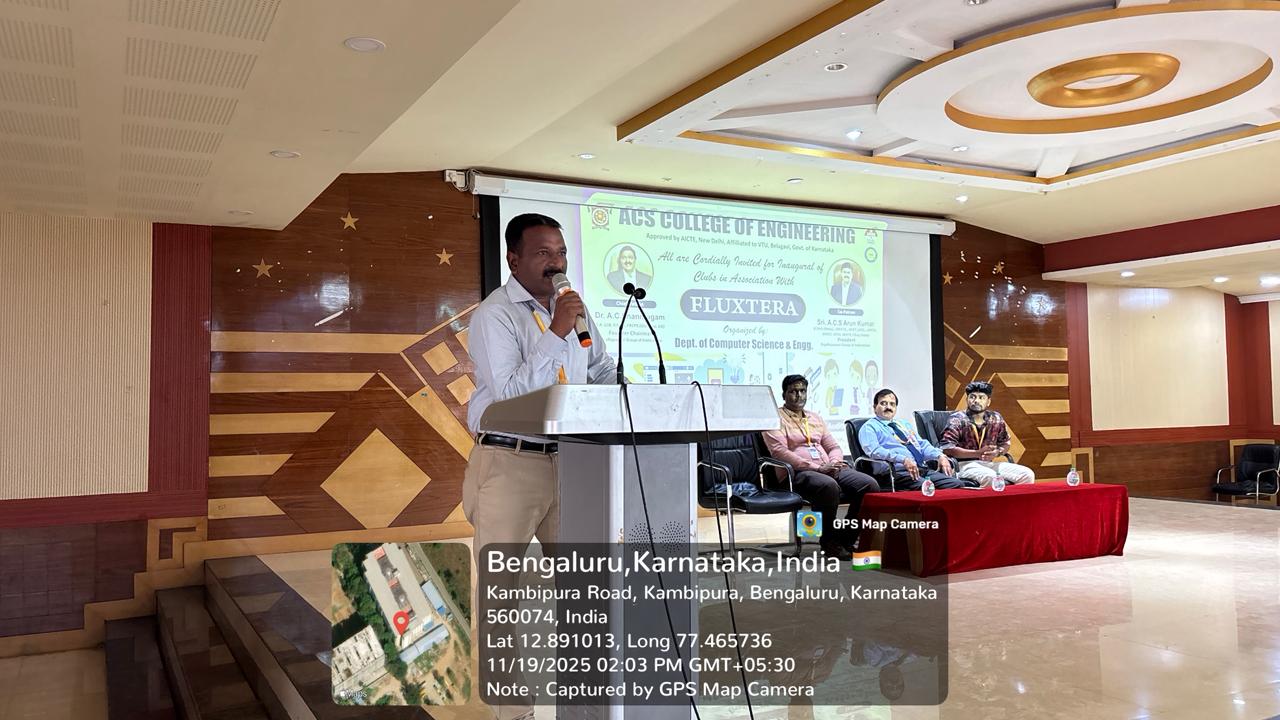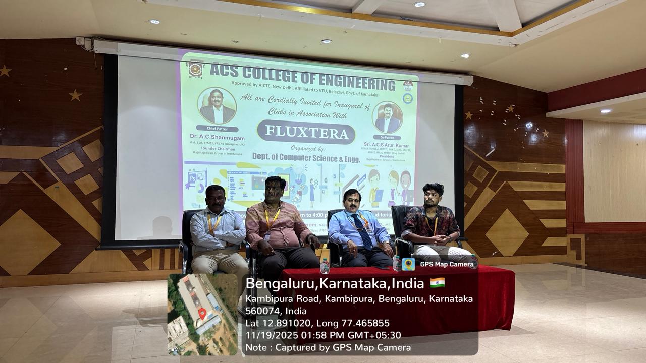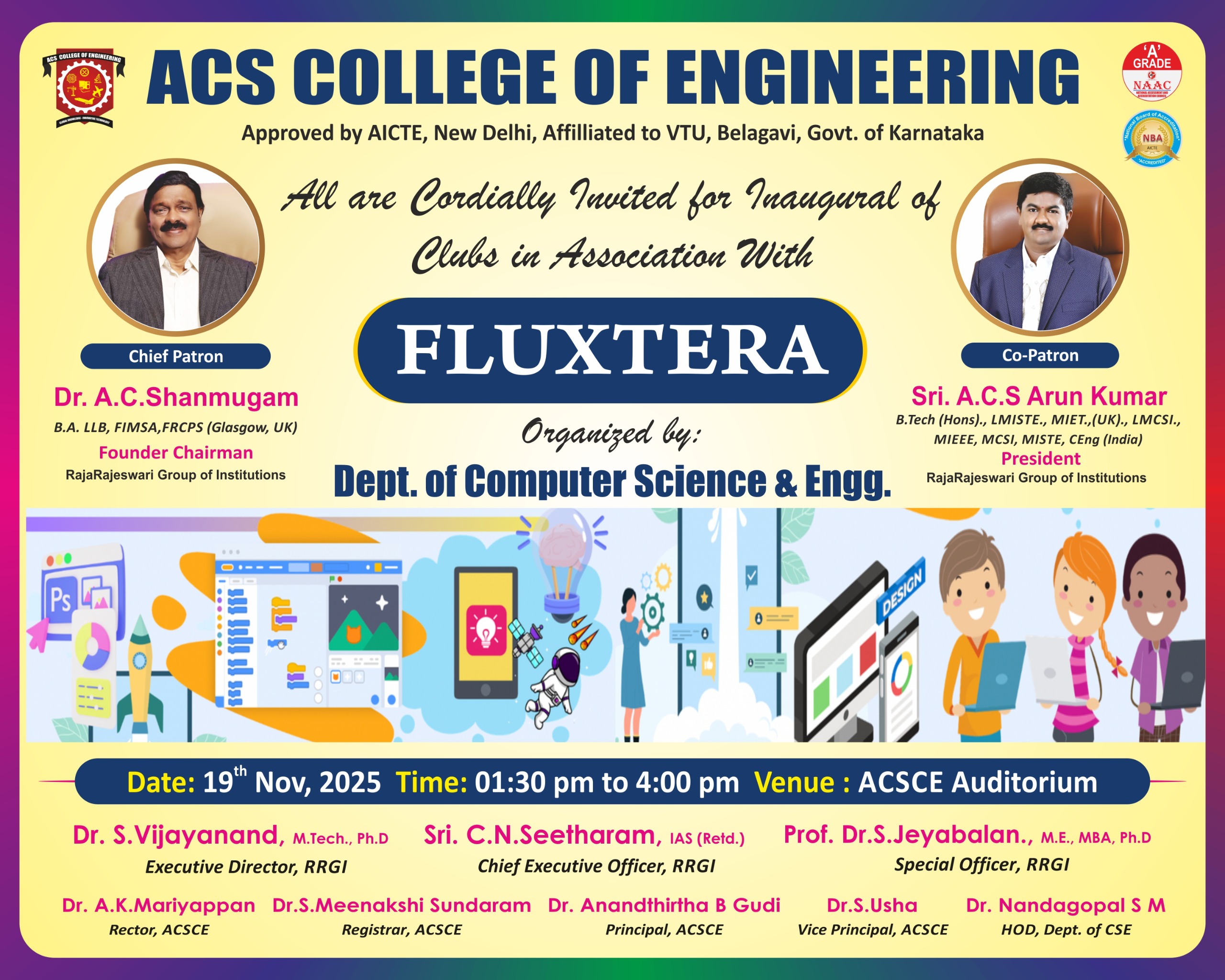 The Department of Computer Science & Engineering (CSE), ACS College of Engineering, organized the Inauguration of Clubs in association with FLUXTERA on 19th November 2025, from 1:30 PM to 4:00 PM, at the ACSCE Auditorium.