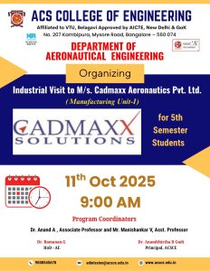 The Department of Aeronautical Engineering, ACS College of Engineering (ACSCE) organized an industrial visit to Cadmaxx Aeronautics Pvt. Ltd., Manufacturing Unit 1 on 11th October 2025 from 10:00 AM to 2:30 PM.