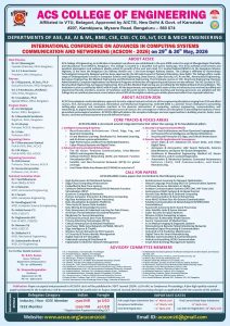 ACS College of Engineering presents the International Conference on Advances in Computing Systems, Communication and Networking (ACSCON 2026), to be held on 29–30 May 2026 at the ACSCE Auditorium.