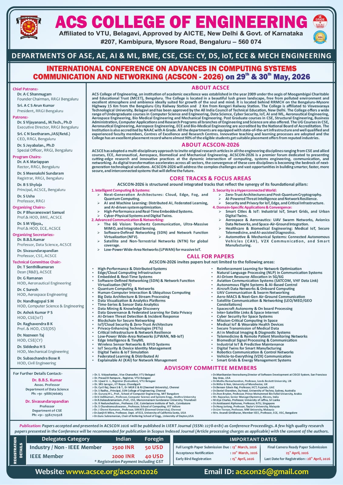 ACS College of Engineering presents the International Conference on Advances in Computing Systems, Communication and Networking (ACSCON 2026), to be held on 29–30 May 2026 at the ACSCE Auditorium.