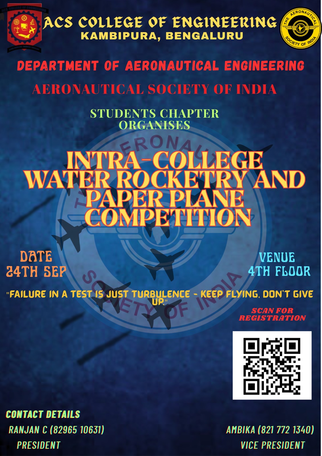 The Department of Aeronautical Engineering, in association with the Aeronautical Society of India (Students Chapter), successfully organized an exciting intra-college Water Rocketry and Paper Plane Competition on 24th September 2025.