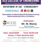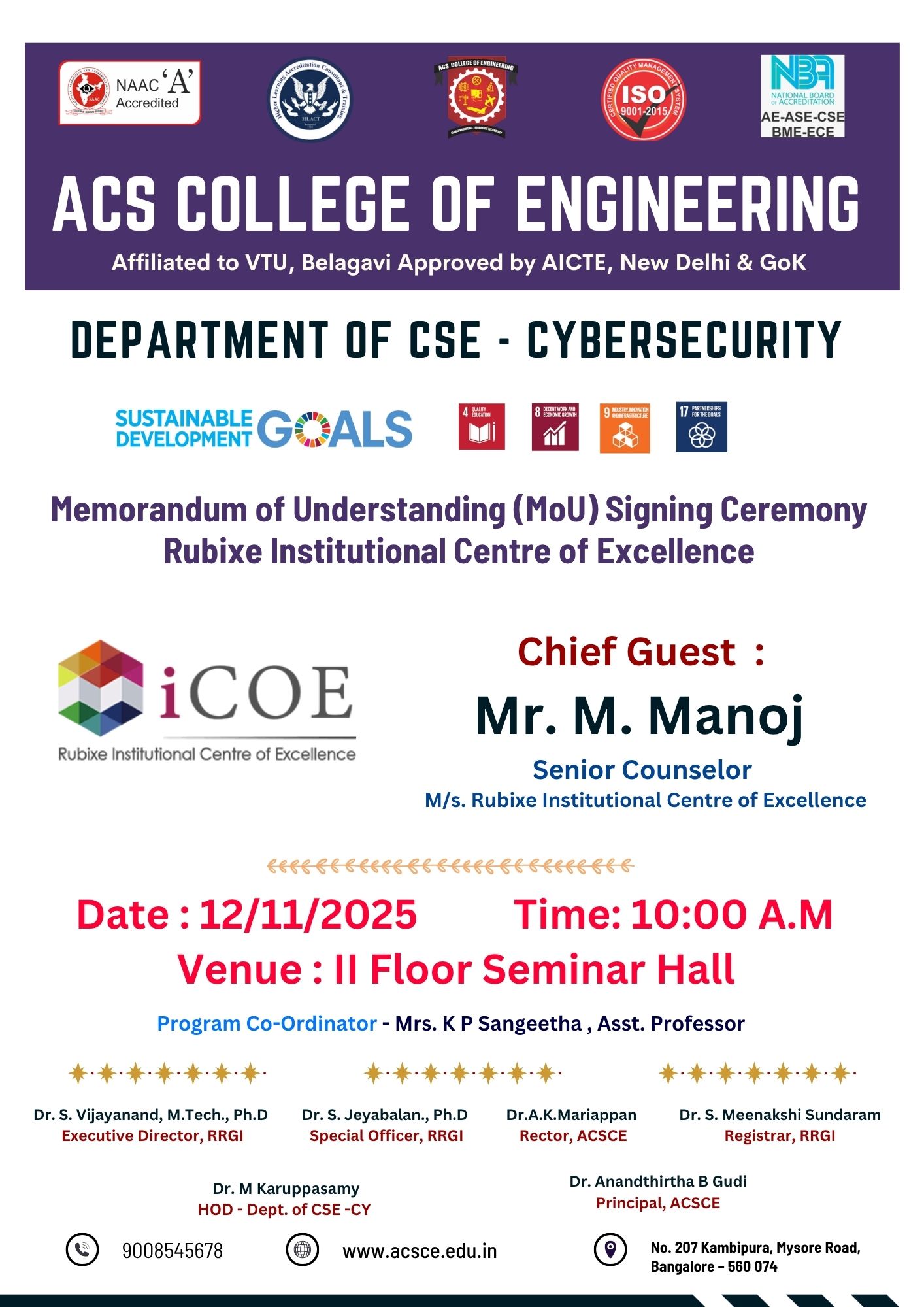 The Department of Computer Science and Engineering, ACS College of Engineering, is organizing a Memorandum of Understanding (MoU) Signing Ceremony with Rubixe Institutional Centre of Excellence.