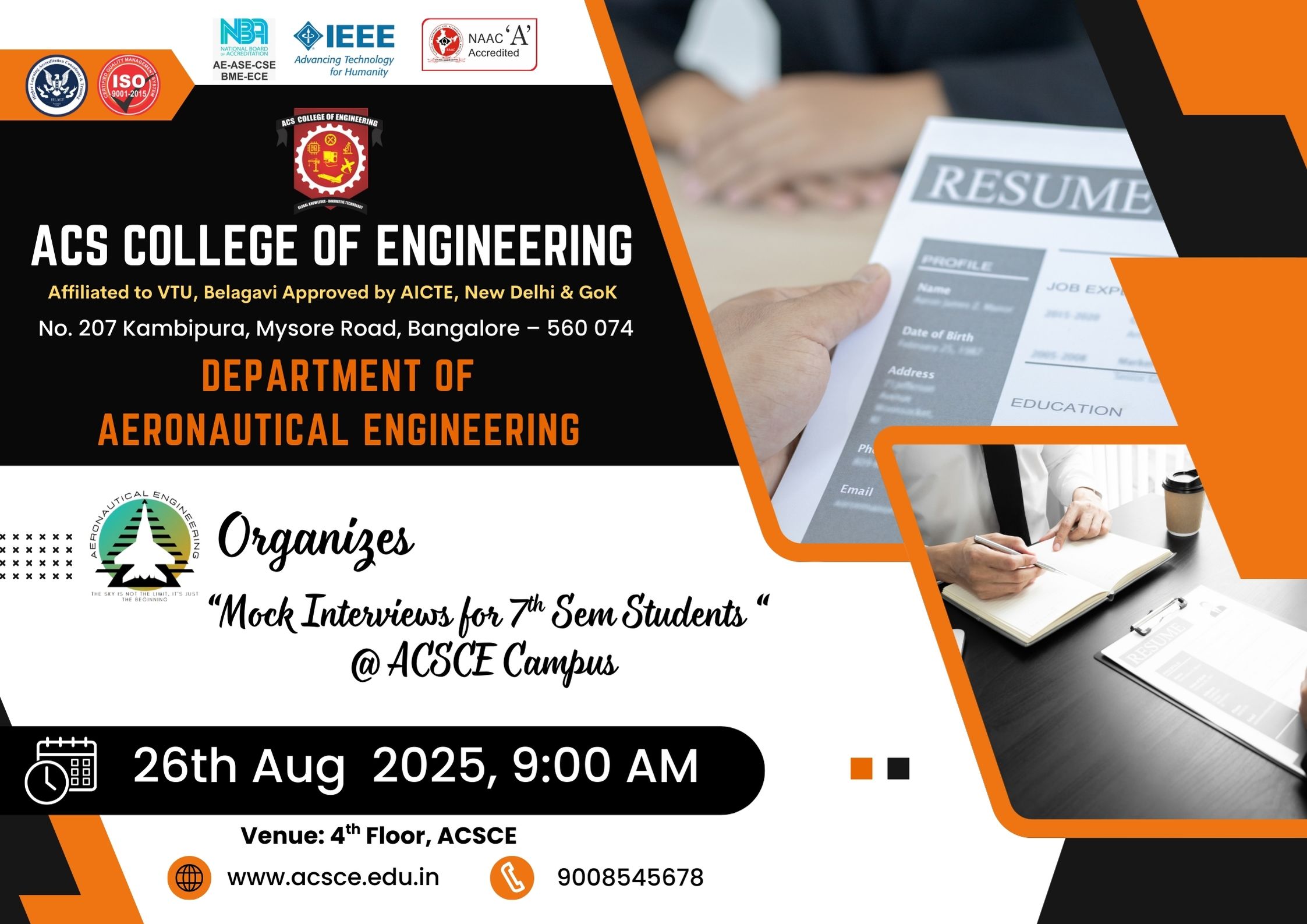 The Department of Aeronautical Engineering successfully organized Mock Interviews for 7th Semester students on 26th August 2025 at the ACSCE Campus.