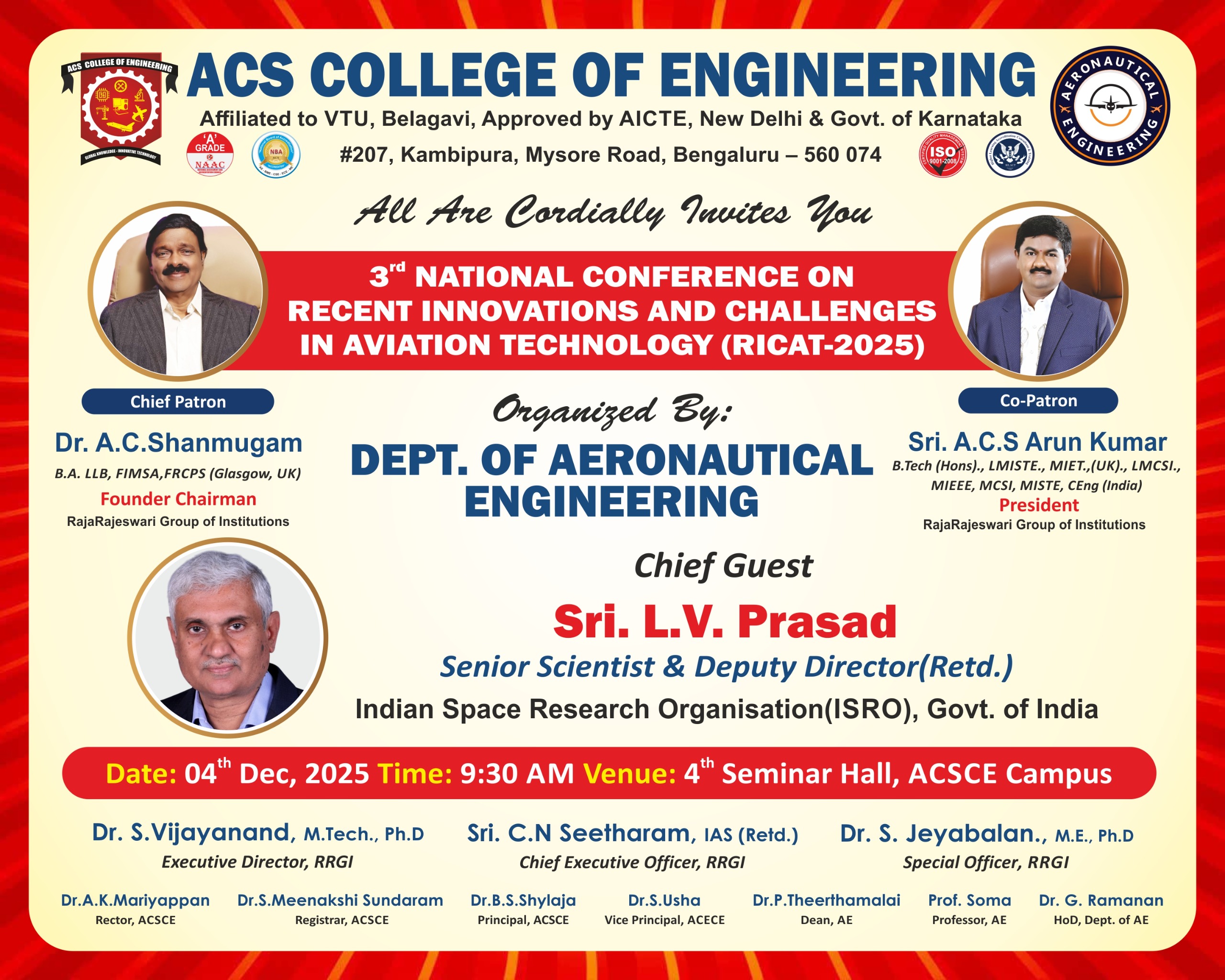 We are happy to share that the Department of Aeronautical Engineering is organizing a National Level Conference on “Recent Innovations and Challenges in Aviation Technology (RICAT 2025)” on 4th Dec 2025 for UG and PG students, Research scholars, Academicians, Industry people, and Scientists.