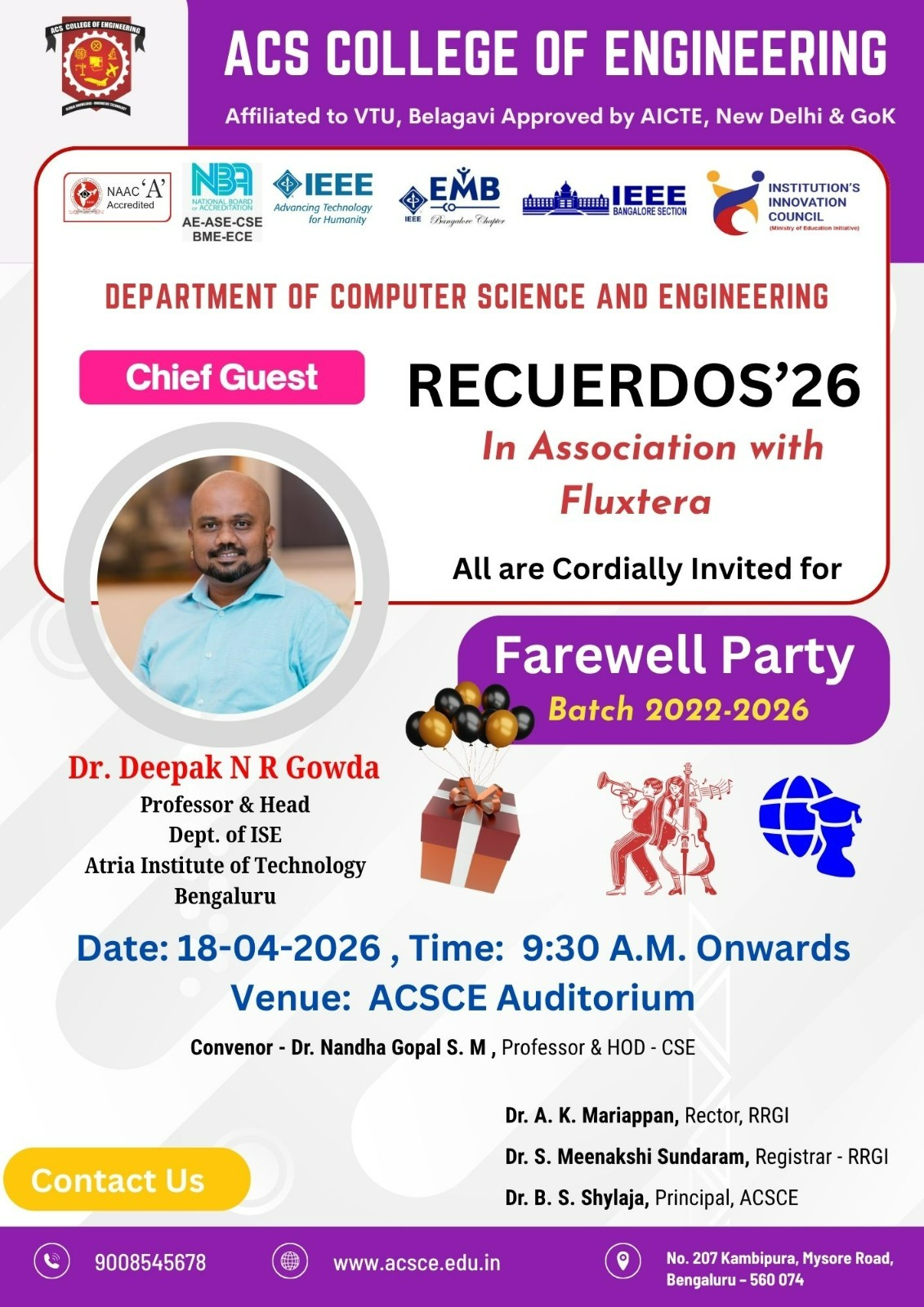 The Department of Computer Science and Engineering, ACS College of Engineering (ACSCE), Bengaluru, cordially invites you to celebrate the grand farewell of the Batch 2022–2026