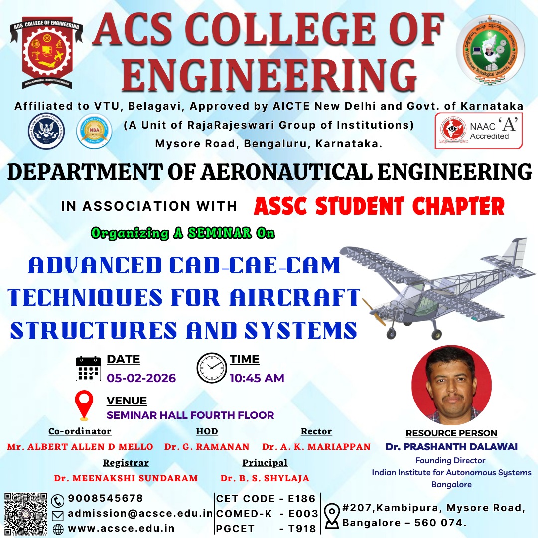 A seminar titled “Advanced CAD–CAE–CAM Techniques for Aircraft Structures and Systems” was organised by the Department of Aeronautical Engineering, in association with the ASSC Student Chapter, at ACS College of Engineering. The event was held on 05 February 2026