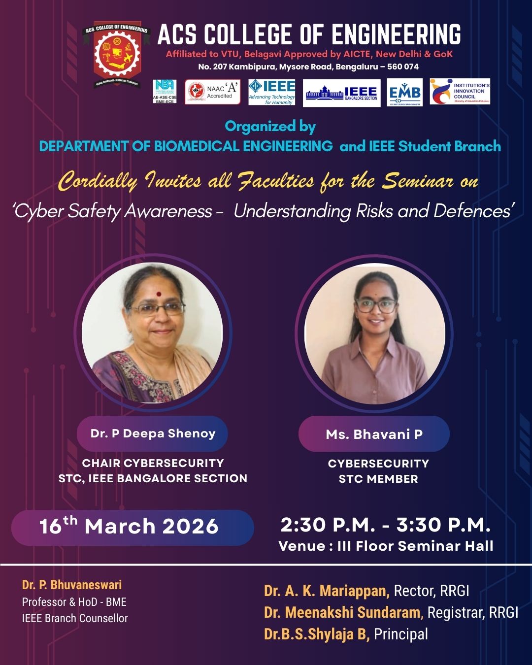 A seminar on “Cyber Safety Awareness – Understanding Risks and Defences” was organized by the Biomedical Engineering and the IEEE Student Chapter at ACS College of Engineering on 16 March 2026 from 2:30 P.M. to 3:30 P.M.