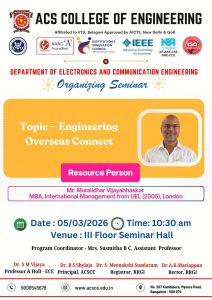 The Department of Electronics and Communication Engineering, ACS College of Engineering organized a seminar on “Engineering Overseas Connect” on 05 March 2026 at 10:30 AM in the III Floor Seminar Hall.