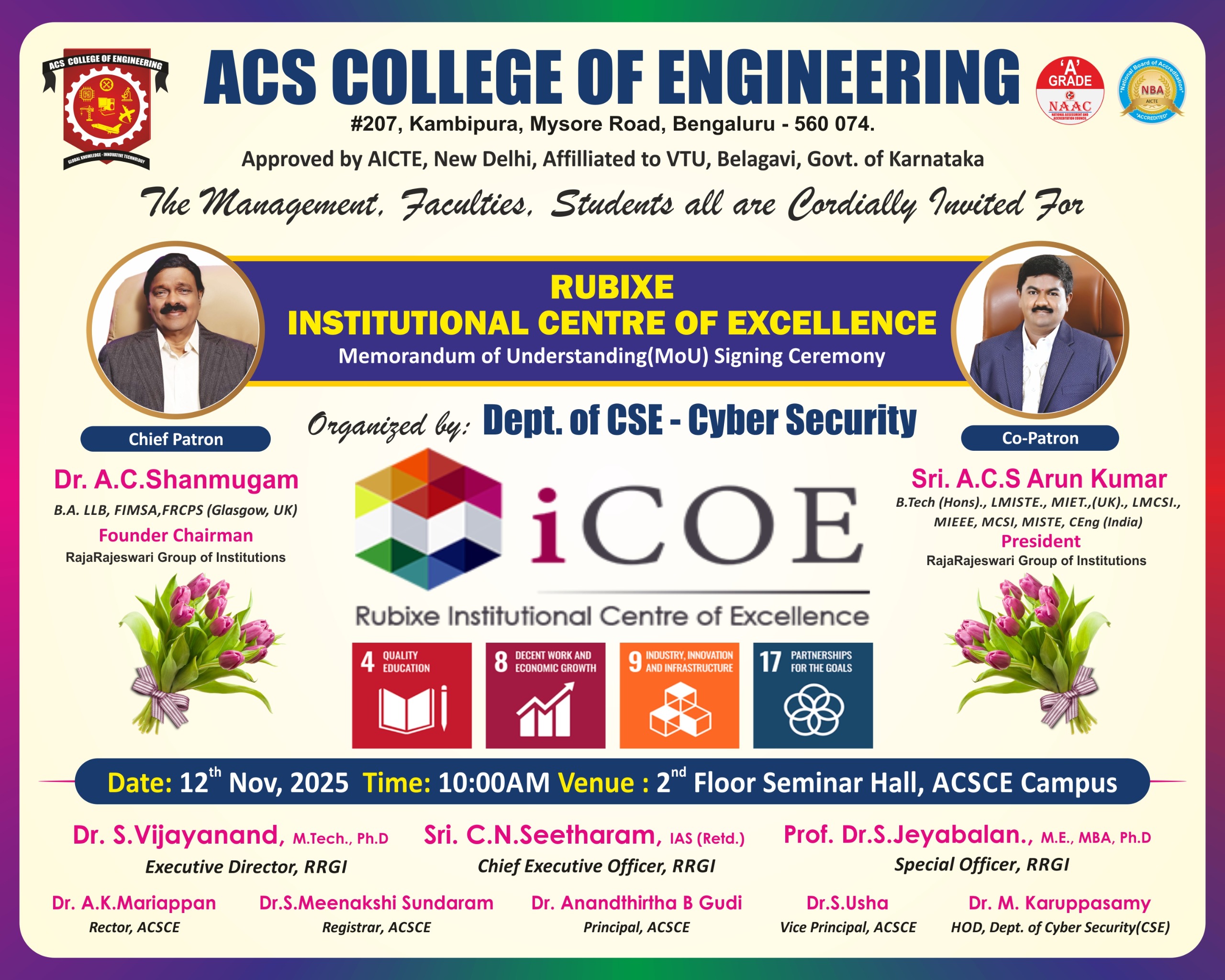 The Department of CSE – Cybersecurity and CSE – Internet of Things (IoT) of ACS College of Engineering jointly organized an insightful seminar on “Hacking and AI Concepts, Real-Time Applications” on 12th November 2025 at 10:30 A.M. in the II Floor Seminar Hall, ACSCE.