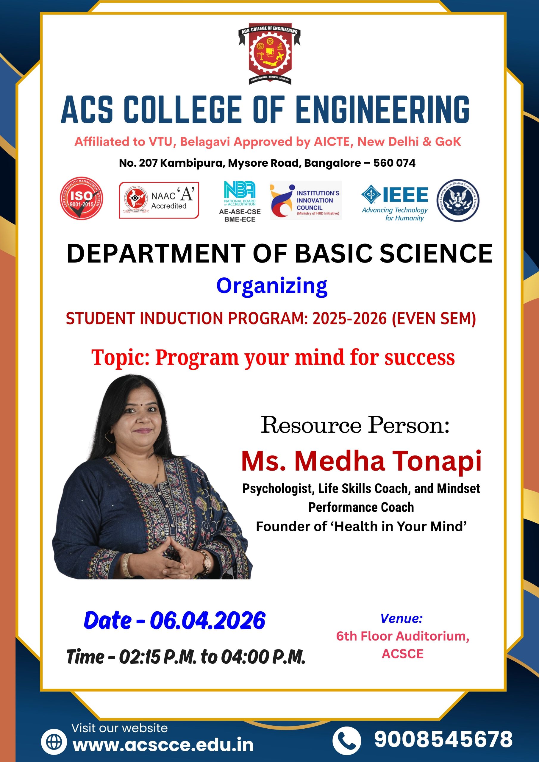 The Department of Basic Science, ACS College of Engineering (ACSCE), is organizing a Student Induction Program session on the topic “Program Your Mind for Success.” The session will be delivered by Ms. Medha Tonapi, Psychologist, Life Skills Coach, and Mindset Performance Coach, Founder of Health in Your Mind.
