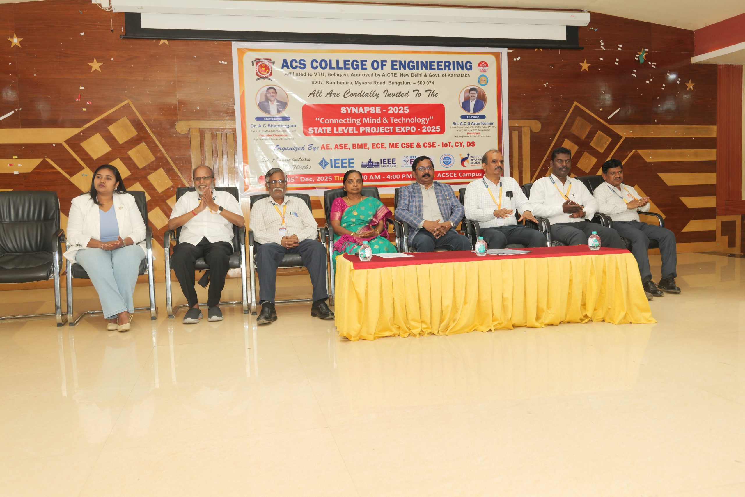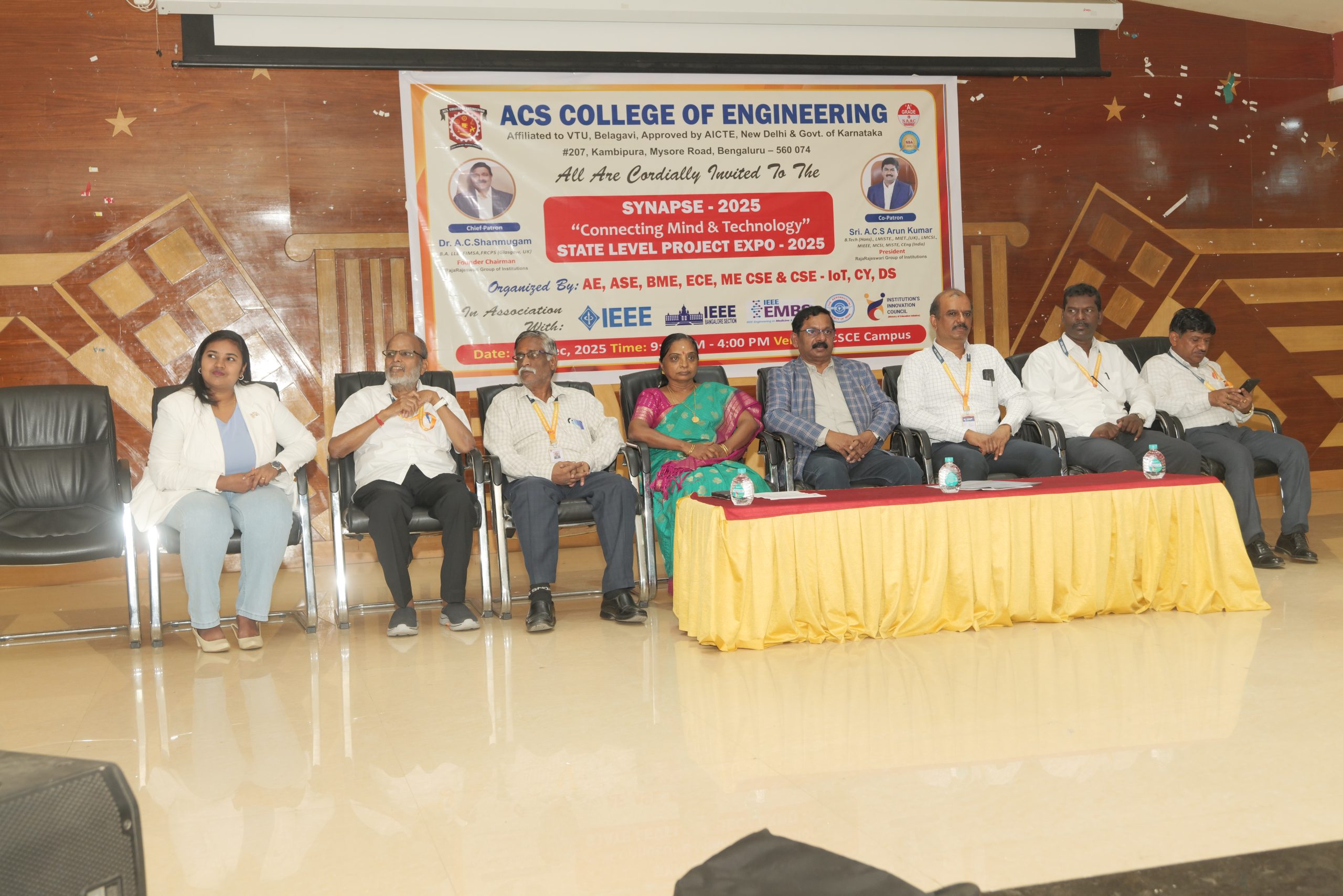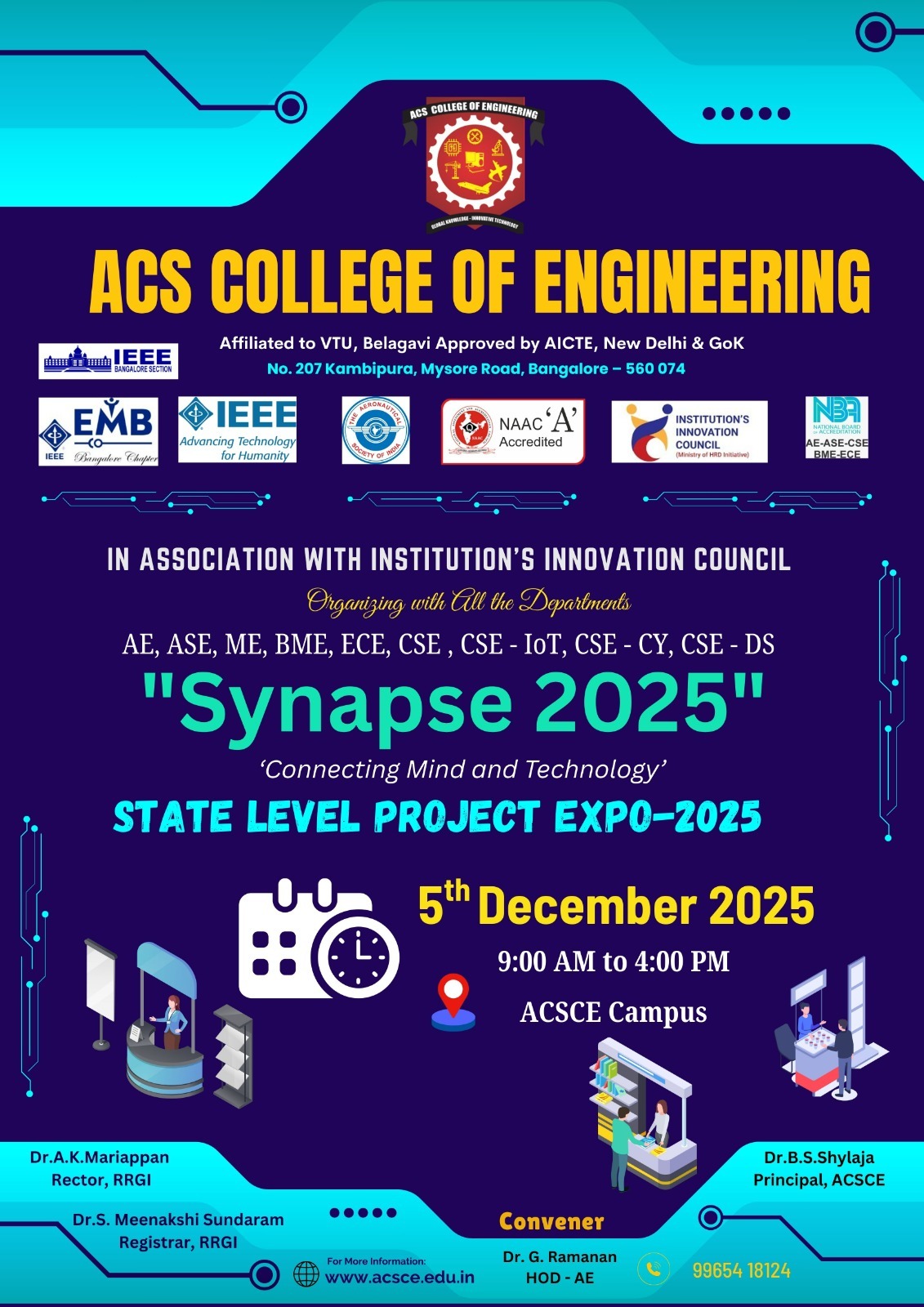 ACS College of Engineering (ACSCE) successfully organized SYNAPSE 2025 – State Level Project Expo in association with the Institution’s Innovation Council (IIC) and all academic departments. The event served as a vibrant platform to promote innovation, interdisciplinary collaboration, and practical application of engineering knowledge among students.
