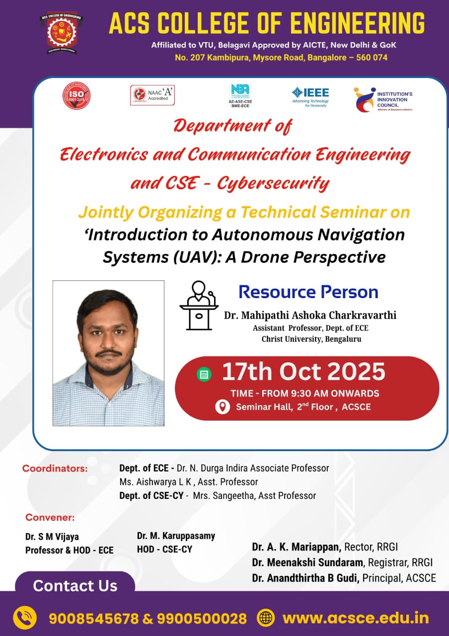 The Departments of Electronics and Communication Engineering (ECE) and Computer Science & Engineering – Cybersecurity (CSE-CY) of ACS College of Engineering jointly organized a Technical Seminar on 17th October 2025.
