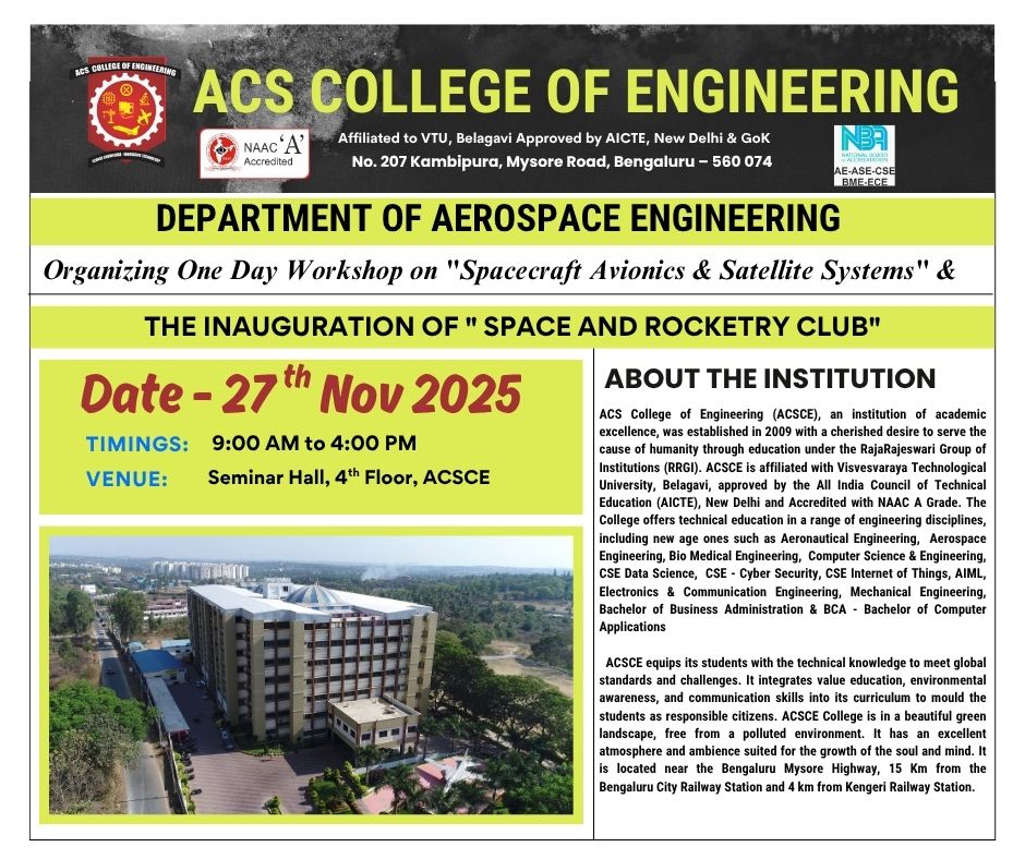 The Department of Aerospace Engineering at ACS College of Engineering successfully organized a Workshop on Spacecraft Technology on 27th November 2025. The event provided students with hands-on exposure to spacecraft design concepts, avionics fundamentals, and satellite system operations, bridging the gap between academic learning and real-world aerospace applications.